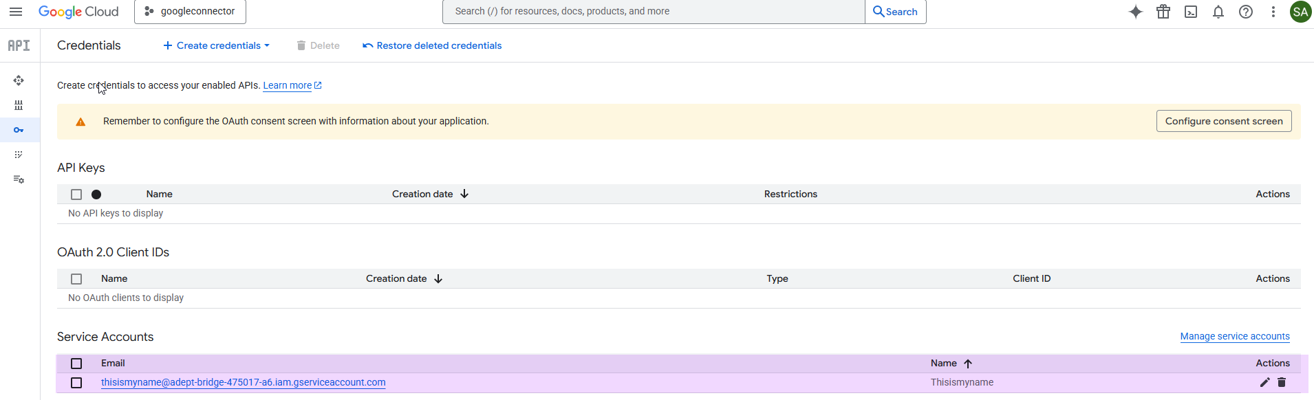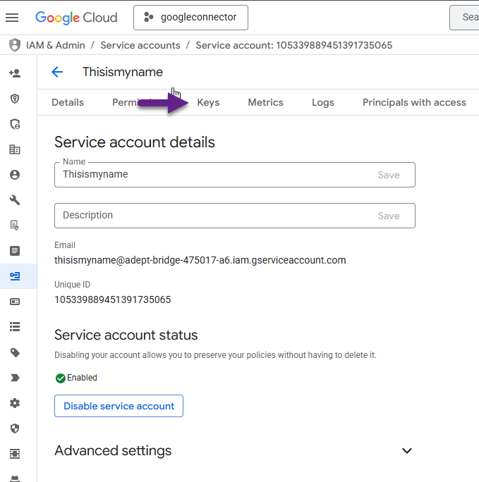 my-service@project.iam.gserviceaccount.com. - If you cannot find it or have closed out of it on accident, go back Google Workspace and navigate to “Managed Service Accounts” to recover it.