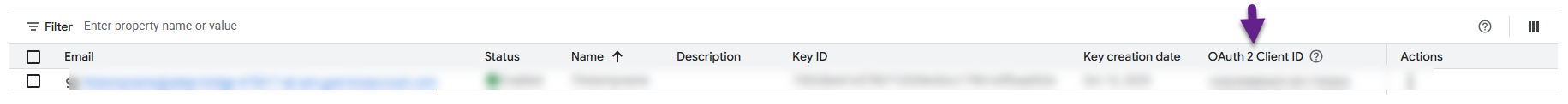 - Locate your service account and make note of the OAuth 2 Client ID.