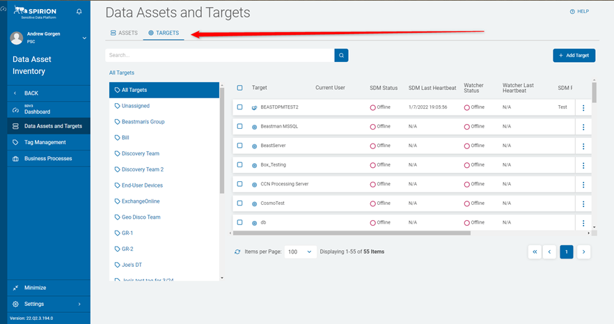 - Select the “Targets” tab under the ‘Data Assets and Targets’ header at top: