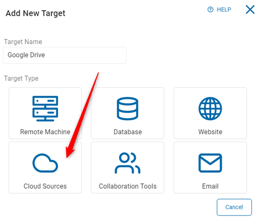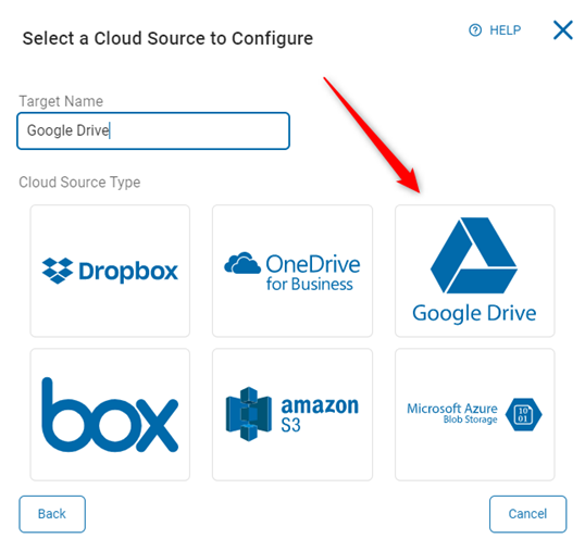 - Select the “Google Drive” tile from the "Select a Cloud Source to Configure" dialog: