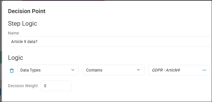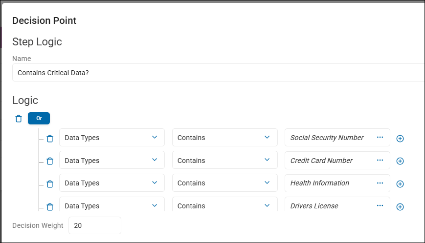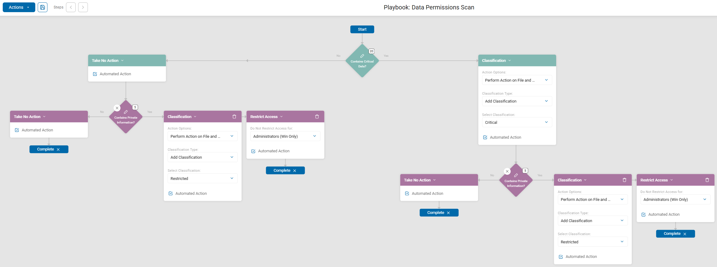 - The first decision point - Contains Critical Data? - asks the question "does the location (file) scanned contain any of the following data types?"