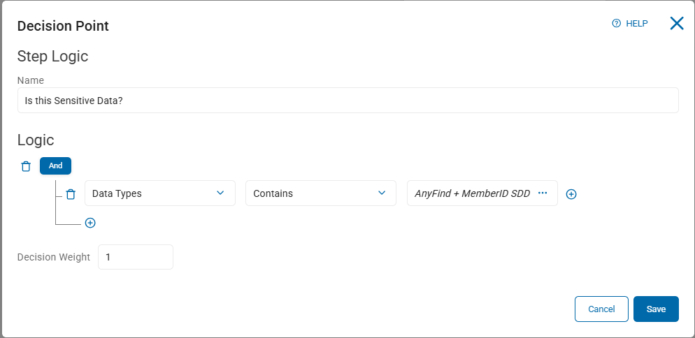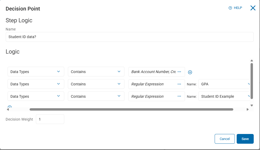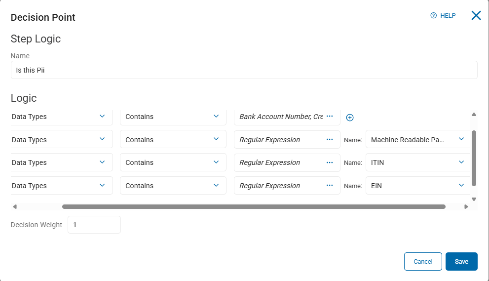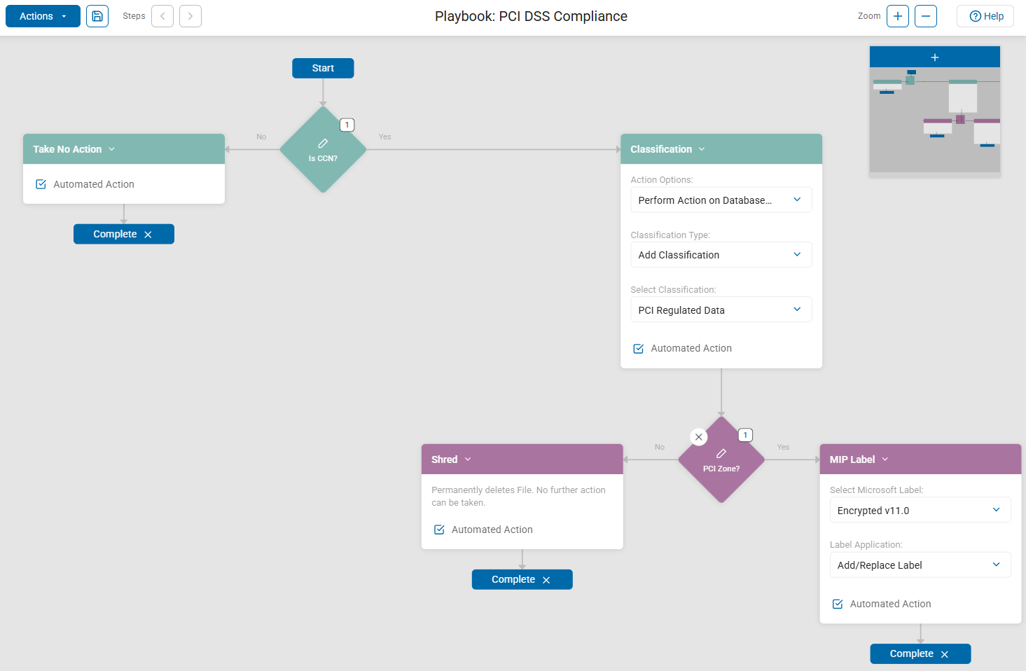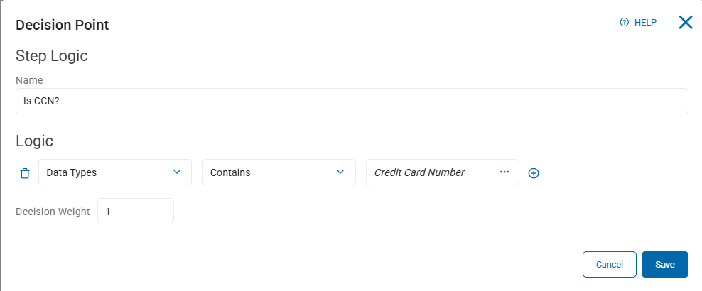 The first decision point is a simple credit card number data type - does the location scanned contain a credit card number?