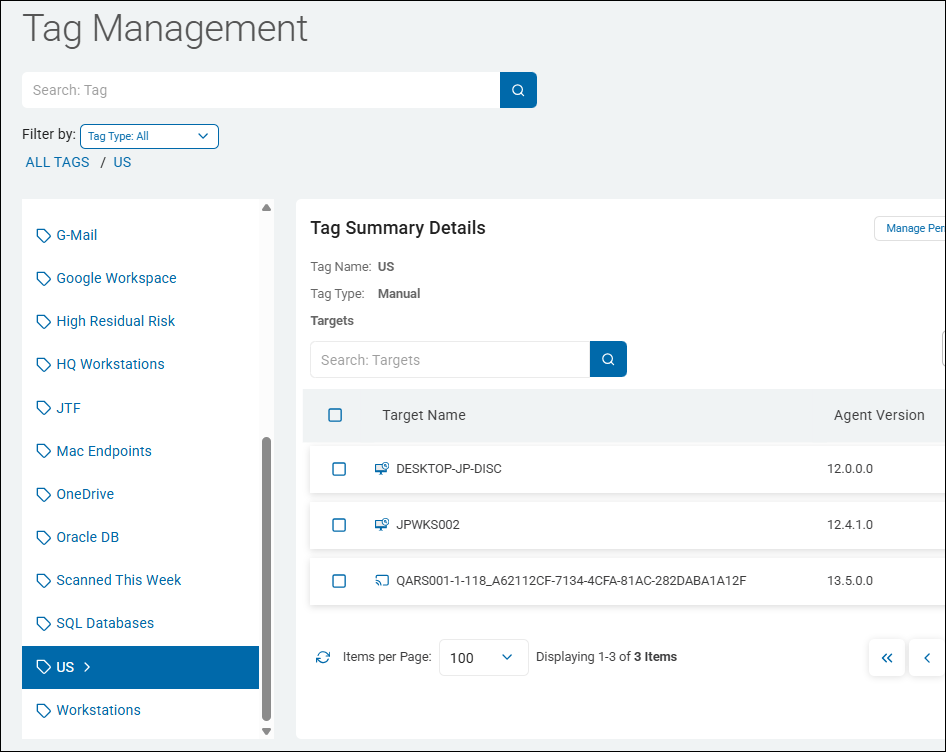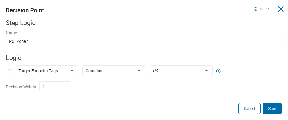 - The second decision point - PCI Zone? - is about Target endpoint Tags. The decision point asks if the location being scanned is on a Target endpoint that has the Tag "US" shown in the Tag Management screenshot below.