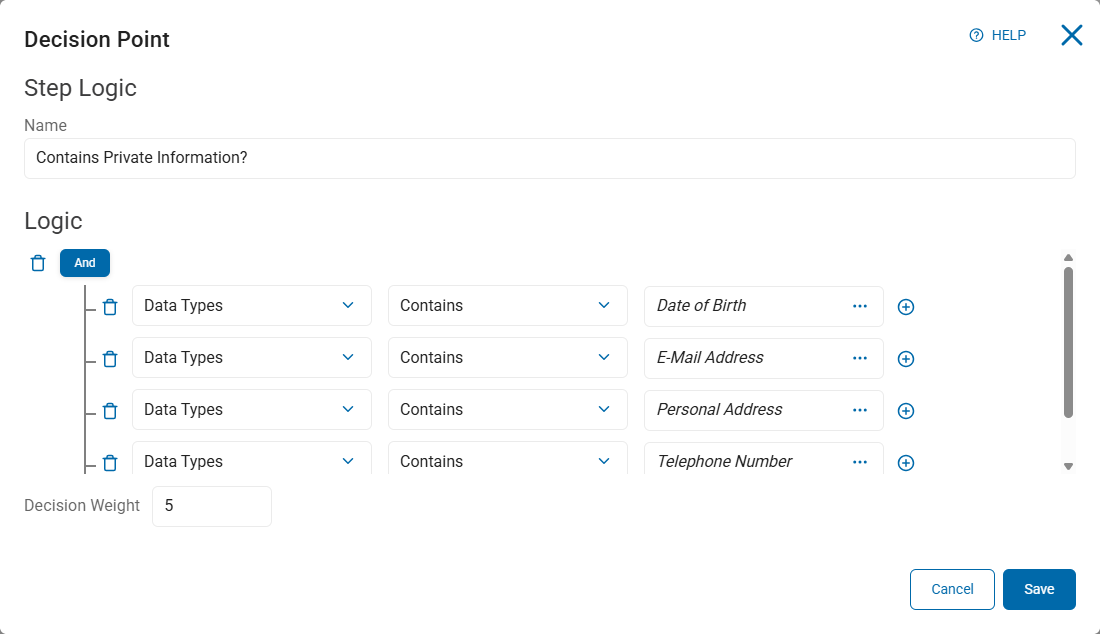 - The second decision point - Does it (the file) contain private information? - asks the question "does the location scanned contain any of the following?"