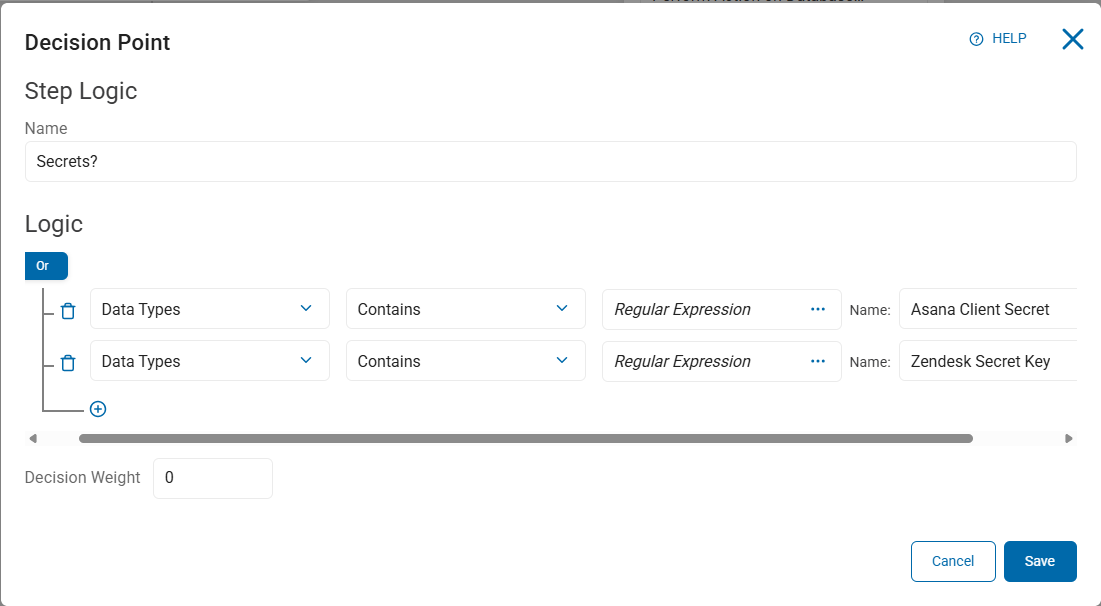 - The first decision point - Secrets? - asks two questions: does the location (file) scanned contain either Asana Client Secrets OR Zendesk Secret Keys?