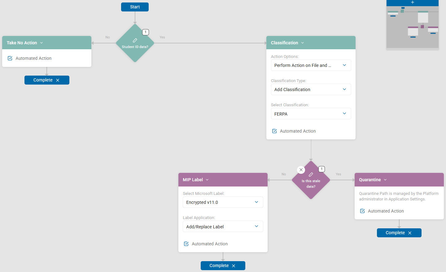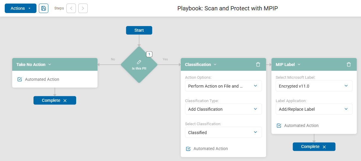 This playbook example classifies locations (scanned files) with SPI and Student ID data as "FERPA," and so long as the data is not considered "stale," the MIP label "Encrypted v11.0" is applied.