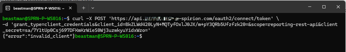 curl -X POST 'https://api.{env}-spirion.com/oauth2/connect/token' \ --data-urlencode 'grant_type=client_credentials' \ --data-urlencode 'client_id=<ID VALUE>' \ --data-urlencode 'scope=reporting-rest-api' \ --data-urlencode 'client_secret=<SECRET VALUE>'2. Confirm response: