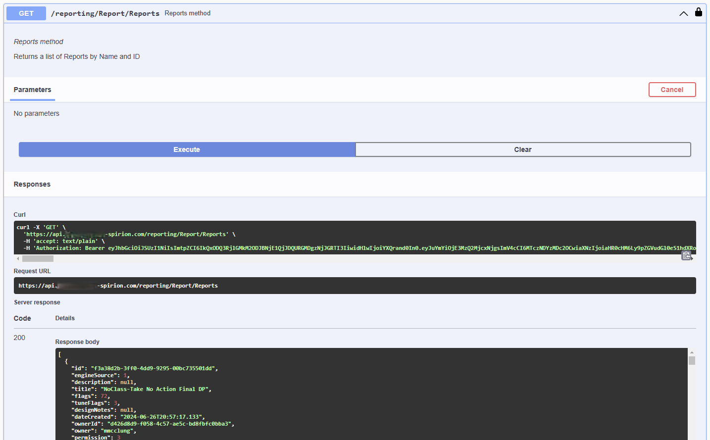 curl -X POST 'https://api.{env}-spirion.com/oauth2/connect/token' \ -d 'grant_type=client_credentials&client_id=<ID VALUE>&scope=reporting-rest-api&client_secret=<SECRET VALUE>'- Replace