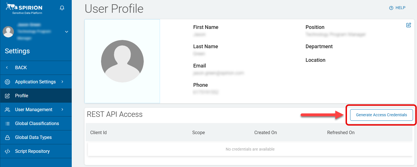 - Confirm that the “REST API Access” pane is displayed and click the white button Generate Access Credentials next to the section heading "REST API Access."
