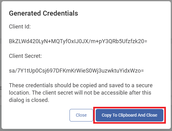 - Click the “Copy To Clipboard And Close” button to copy the “Client ID” and “Client Secret” then paste/store somewhere for later reference, using appropriate security measures to protect this information (the credentials above are not valid).