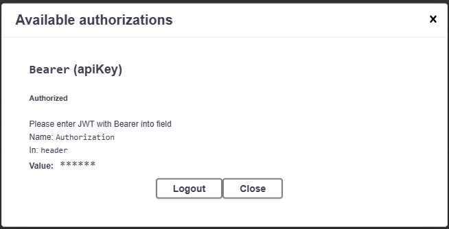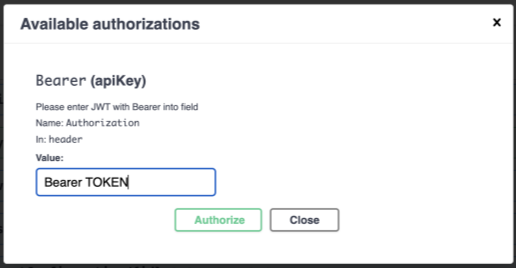 - From its UI, click the “Authorize” button and type in the word “Bearer” followed by the token generated in the previous step.