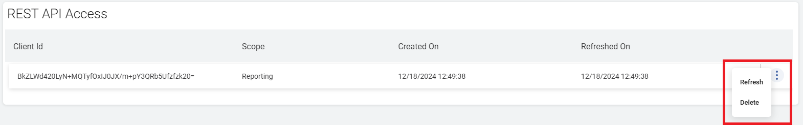 NOTE: The Client Secret is not available for later retrieval. If you lose it and/or need to generate a fresh set of credentials, you can do so with the “Refresh” option available in the hamburger menu on the right (see screenshot above). - When the pop-up window closes the generated Client Id is displayed with some additional details.