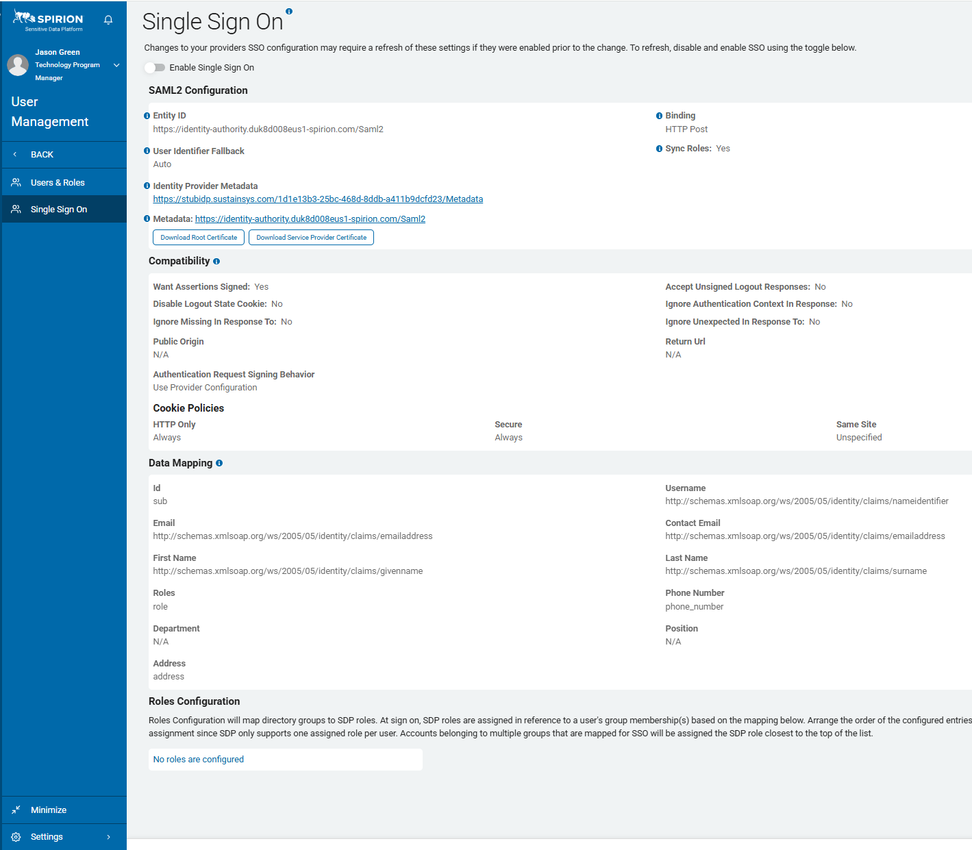 - If disabled, roles are manually assigned from the Spirion Sensitive Data Platform UI.