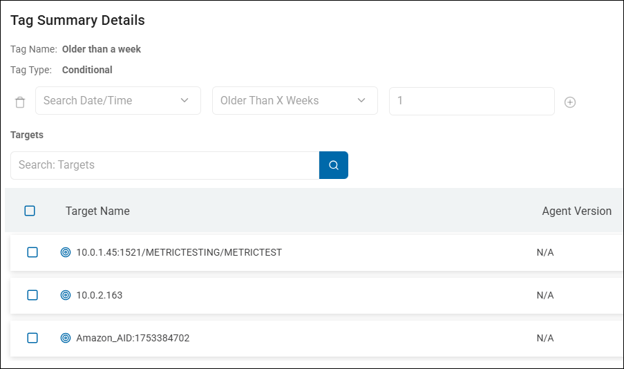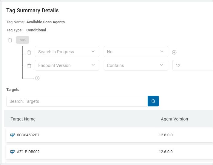 - Conditional - Add Agents and Targets by condition. In this type, an Agent/Target must satisfy the conditions of the Tag, set by you, to be a member of the Tag group.