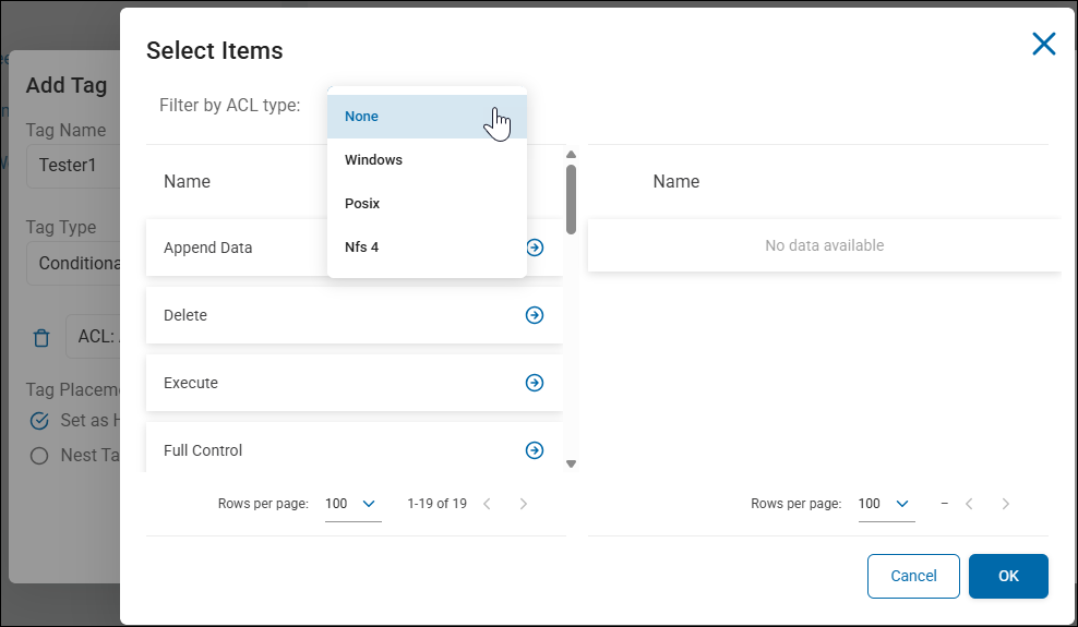 ACL: Ace Type | Contains Does Not Contain Is Empty Is Not Empty | A filter which restricts based upon the ACE (Access Control Entry) Type. | Specify the value to be used to qualify the data.