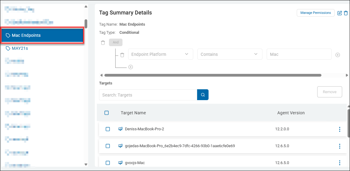 - Agent Management page: All Agents/Targets captured by this Tag, "Mac Endpoints," are shown on the Agent Management page.