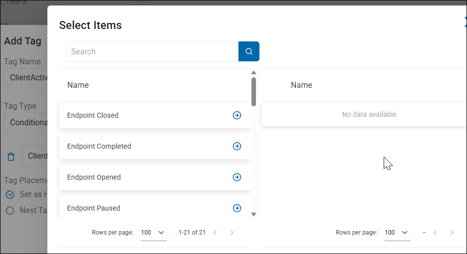 Tag Name | Equals Does Not Equal Contains Does Not Contain Begins With Does Not Begin With Ends With Does Not End With Is Empty Is Not Empty | A filter which restricts by the name of the Tag the Agent/Target (endpoint) is a member of. | Specify the value to be used to qualify the data. For example, if you created a rule as follows: