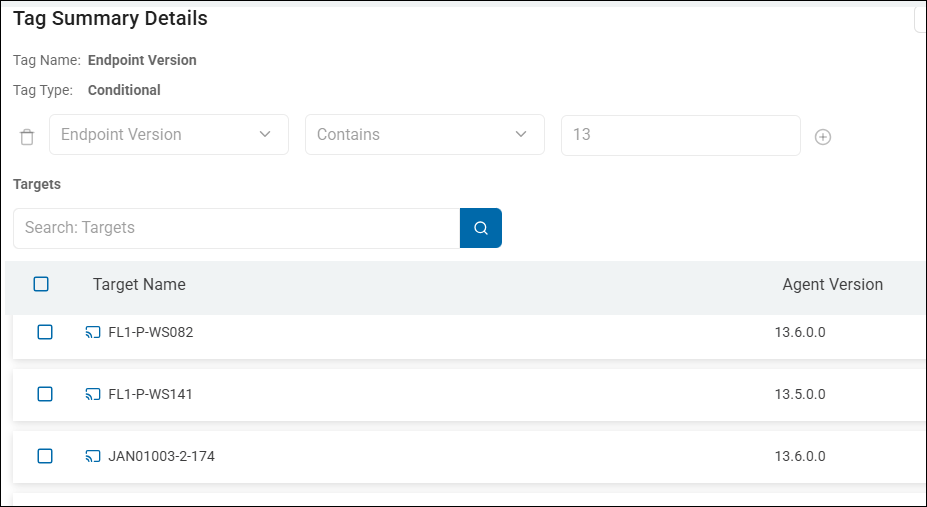 Endpoint Version | A filter which restricts by the version of the Agent (endpoint). In the example below, only Agents (displayed as Targets - Agents can act as Targets) whose version number contains a 13 (v13-13.6) are shown. | Specify the Agent version to use to qualify the data. Examples: v13.6 Agents only