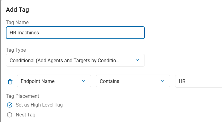 - You can capture multiple Agents/Targets using a Conditional type Tag when the department terms such as "-HR-", "-Fin-", "-Legal-", etc, are contained within the host name or machine name