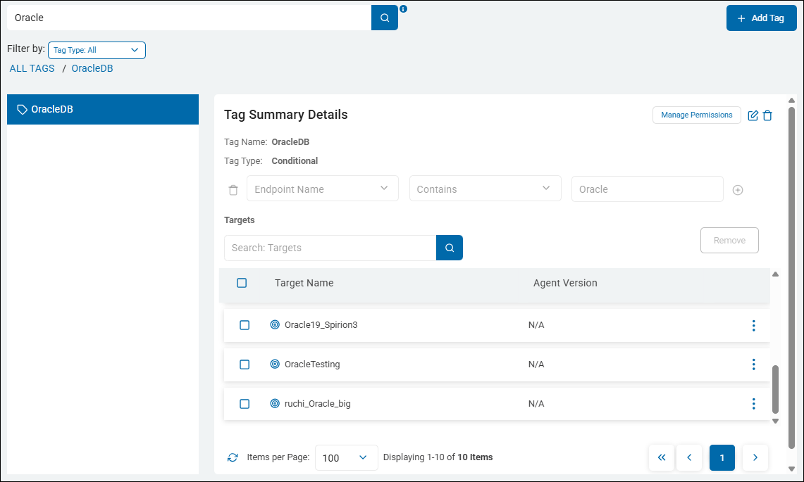 - In the example below the Targets captured by this manual tag include an Oracle database ("OracleTesting" Target) and an Oracle database server (Oracle19c).