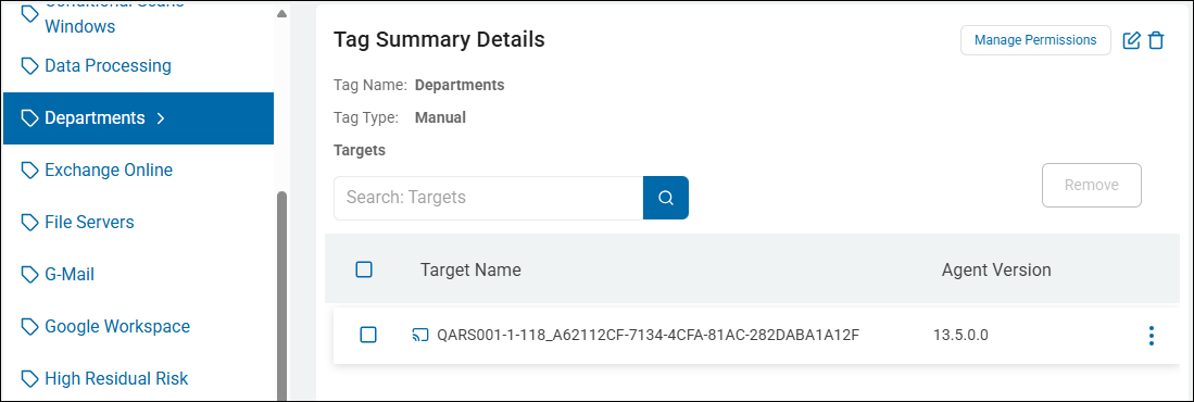 - Tags typically group Agents/Targets by operating system, Spirion Agent version, Department, Target Type such as OneDrive, Exchange, etc.
