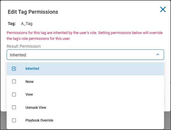 - The "Result Permissions" for the Tag being edited controls the user's access (None, View, Inhertied, etc.) to the Tag.