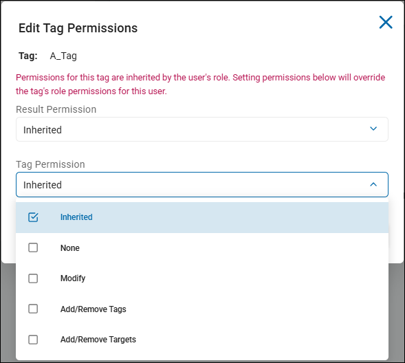 - Before making any changes note the warning on the pop-up window: "Permissions for this tag are inherited by the user's role. Setting permissions below will override the tag's role permissions for this user."