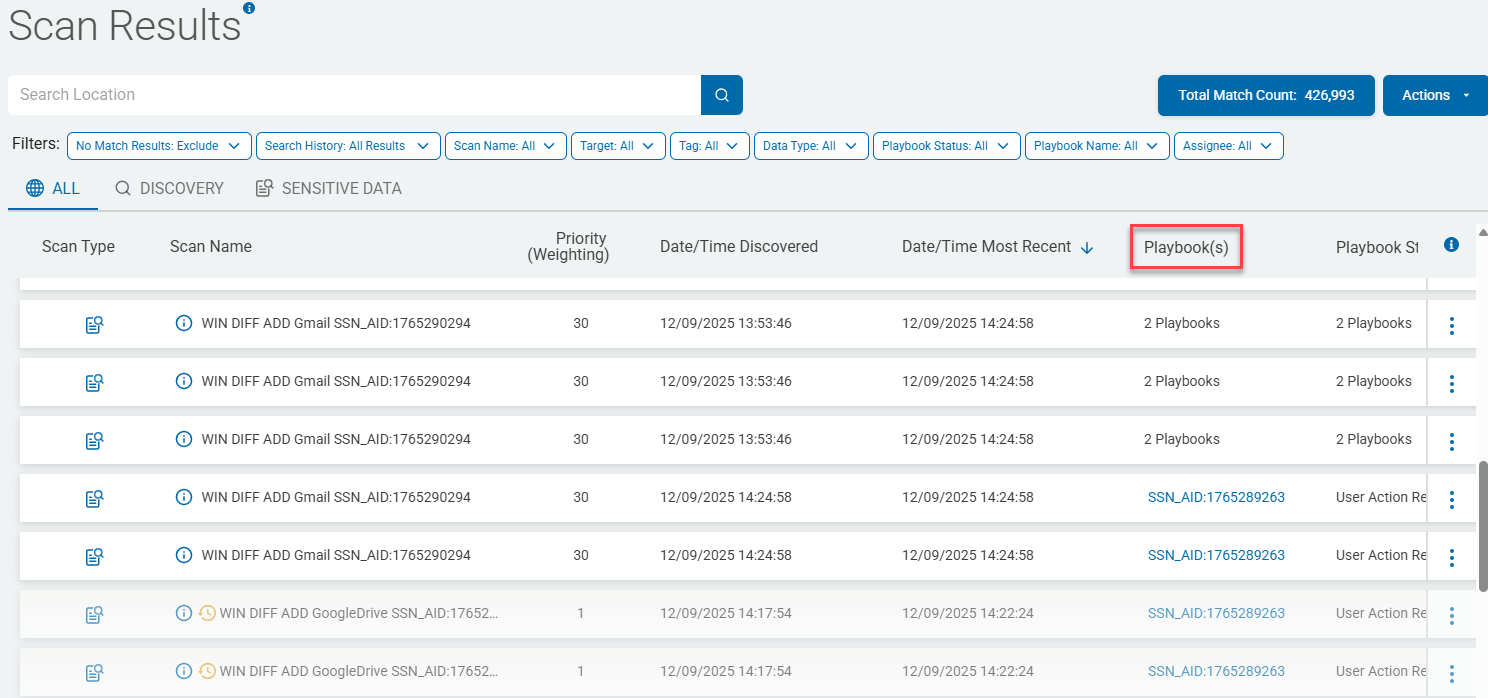 - Under the Playbook(s) column click the playbook link. If multiple playbooks were executed during the scan, hover your mouse over the entry (2 Playbooks, for example) and select the playbook that has the sensitive data file information you are looking for.