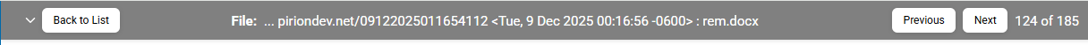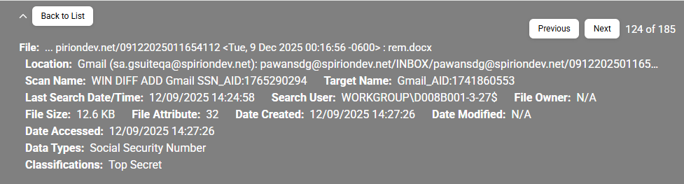 - In the screenshot below, 185 files containing sensitive data were found, and the header is currently displaying file 124 out of a total of 185 files.