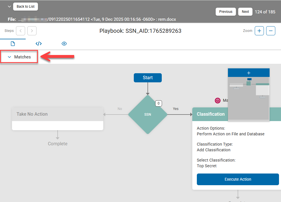 For example, if you are looking for information about social security number data matches, your playbook name is mostly likely prepended with the characters "SSN" or something similar. - The Playbook Executor page opens with file locations (file name and path) at the top of the page. These files contain the sensitive data the scan was configured to search for.