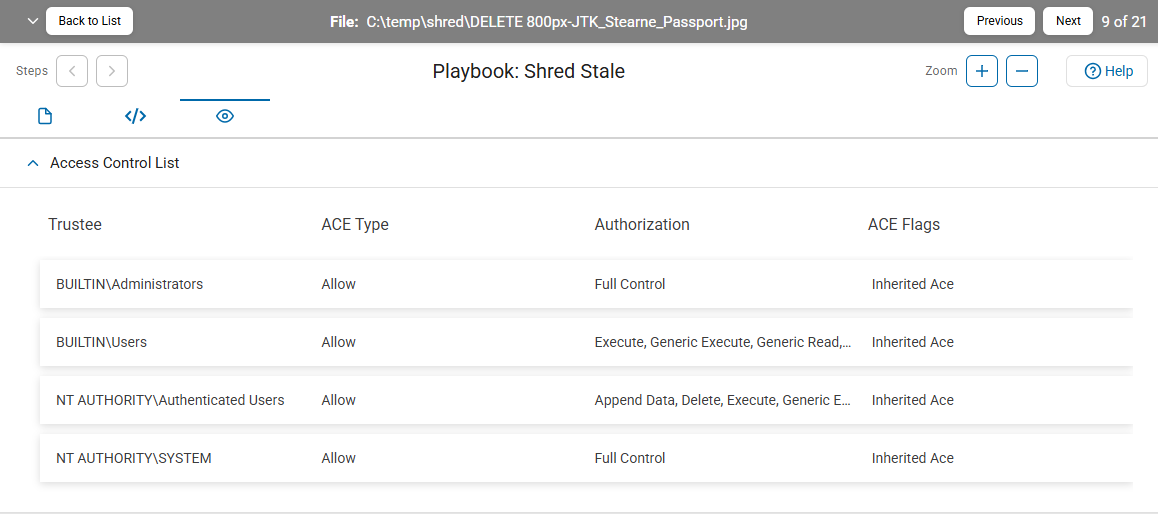 The Access Control List section of the playbook executor displays the permissions attached to a file and the users and system processes to which those permissions have been granted.