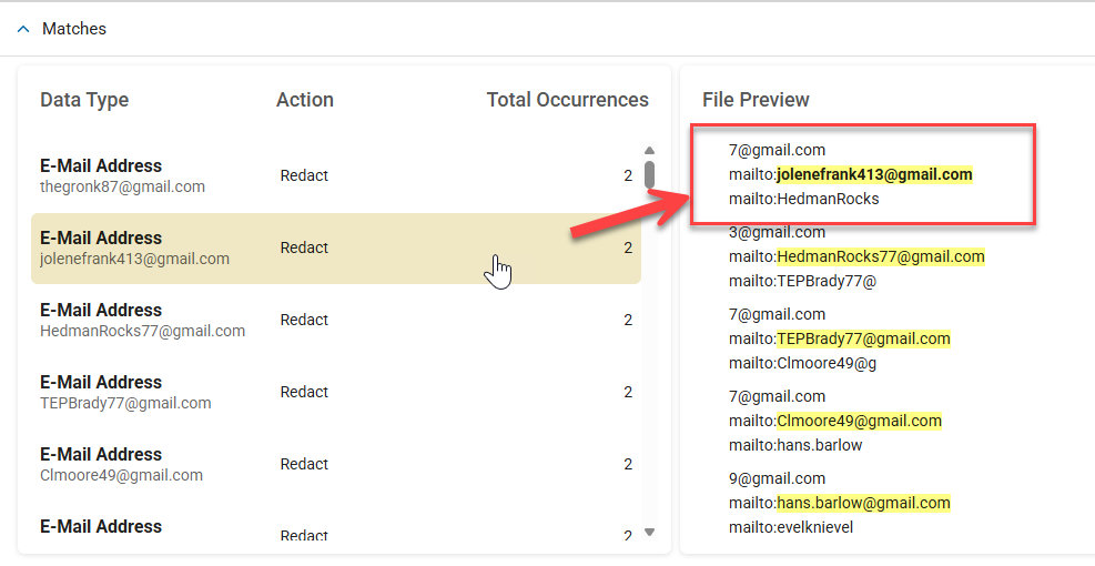 - In the Matches section, click the down arrow to expand the section and reveal information about the sensitive data matches discovered by your scan such as the data type (social security number, credit card number, date of birth, etc.), action taken on the data (classification, quarantine, etc.), total occurences, and a preview of the data match itself.