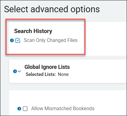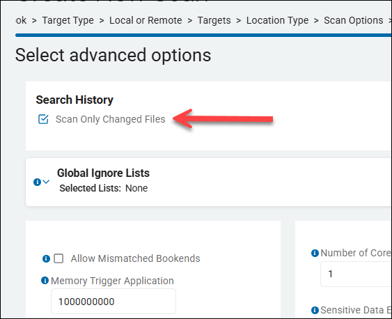 - When creating a new scan, approximately the 11th step in the step-by-step wizard is a Select advanced options page under Search History with the option Scan Only Changed Files