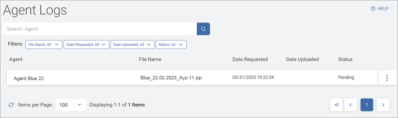 The Agent Logs page displays the agent logs collected via Gather Data requests. On this page you can search for a specific logs, view log status, upload counts, and download Agent Log Gather Data.