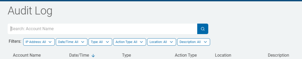 You can search for an Audit log by Account Name, Action Type, or Location.