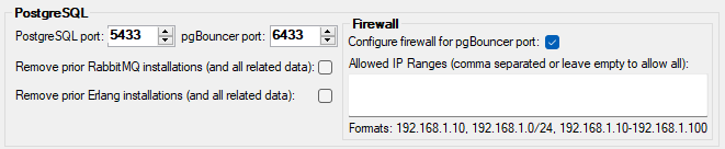 - Configure firewall for pgBouncer port - Check this checkbox to configure the Microsoft Windows native firewall to allow traffic through the specified pgBouncer port. Note: This does NOT apply to any other firewalls running on your machine or on your network.