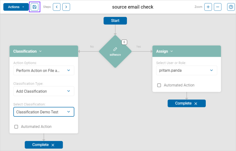 - Click the save icon in the top left portion of the screen next to the blue "Actions" button.